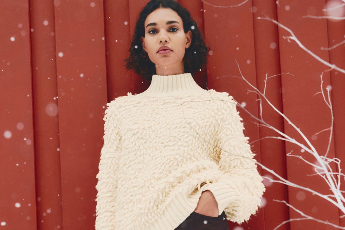 The $46 Cloud-Yarn Textured Funnel Neck Relaxed Jumper is the knitted item. This warming jumper costs less than Claudia’s Isabel Marant version and is made of soft cloud yarn with a cosy neckline.