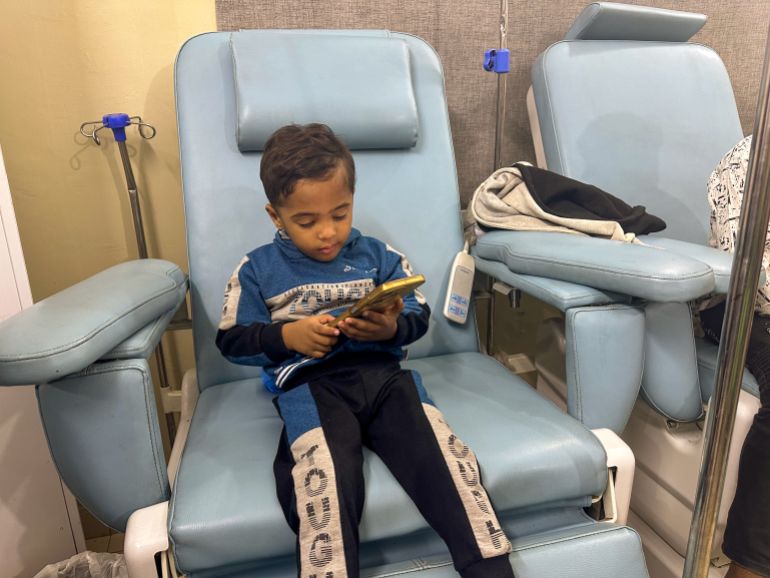 Abdul Hadi is one of the youngest in the room. Children are seated quietly in front of him, some restrained from receiving blood from their IV drips. Nearby, a mother sits at the foot of her 12-year-old son’s reclining chair, gently massaging his leg.