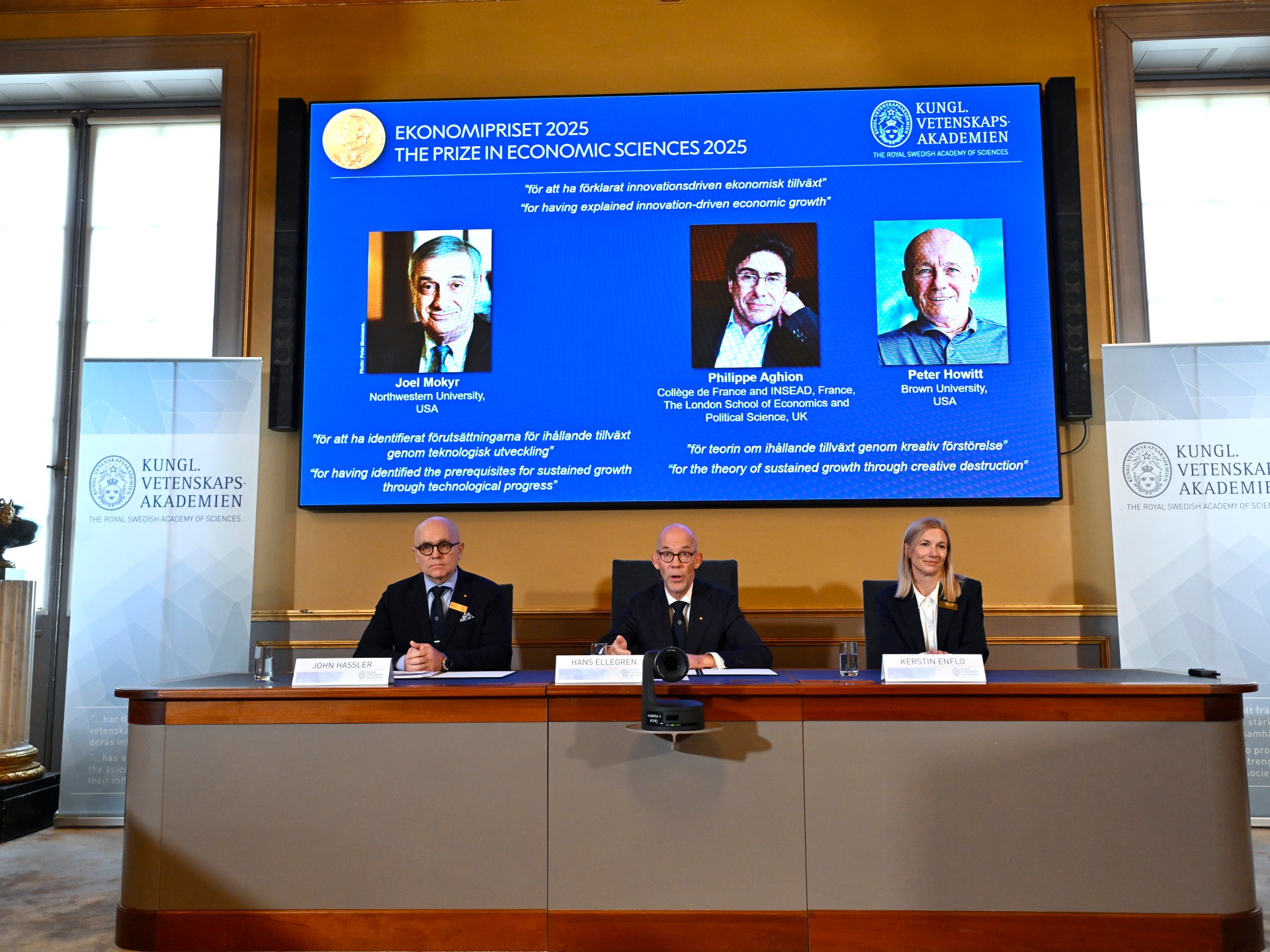 The Royal Swedish Academy of Sciences announced on Monday that the Sveriges Riksbank Prize in Economic Sciences in Memory of Alfred Nobel 2025 would be shared among American-Israeli Joel Mokyr, France’s Philippe Aghion and Canada’s Peter Howitt “for having explained innovation-driven economic growth”.