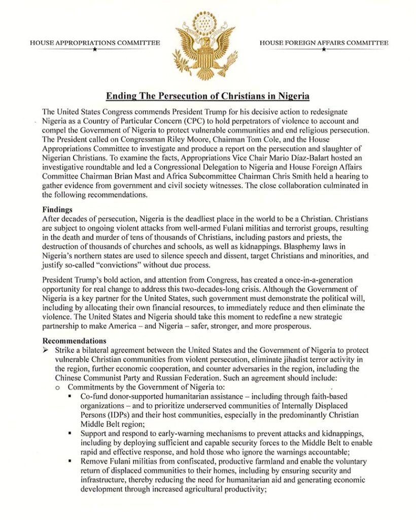 The report outlines several recommendations, including the establishment of a bilateral US–Nigeria security agreement aimed at protecting vulnerable Christian communities and dismantling jihadist networks. It also proposes withholding certain US funds until the Nigerian government demonstrates concrete action to halt violence against Christians.